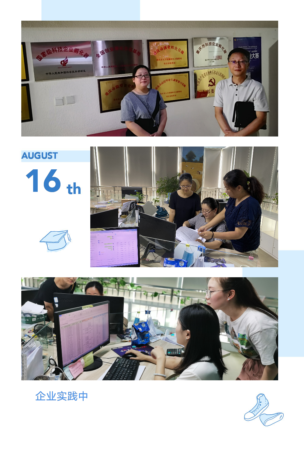 根据学校关于开展暑期教师企业实践活动的安排,更好的为课程人才培养方案的修订、教学质量评价提供依据,为了加强教师自身业务能力和实践动手能力,使教师所教、学生所学、市场所需达到有机结合,通过企业实践,提高中等职业学校教师专业技术知识和技能水平,从而全方位提升教师综合素质。现代服务系按教研组划分,7月20日—8月15日期间分别到重庆勤典财务咨询公司、重庆汇杰医药有限公司、渝中区敏学精英课外培训中心、京邦达物流有限公司、爱儿坊幼儿园等8家企业进行企业实践学习。
