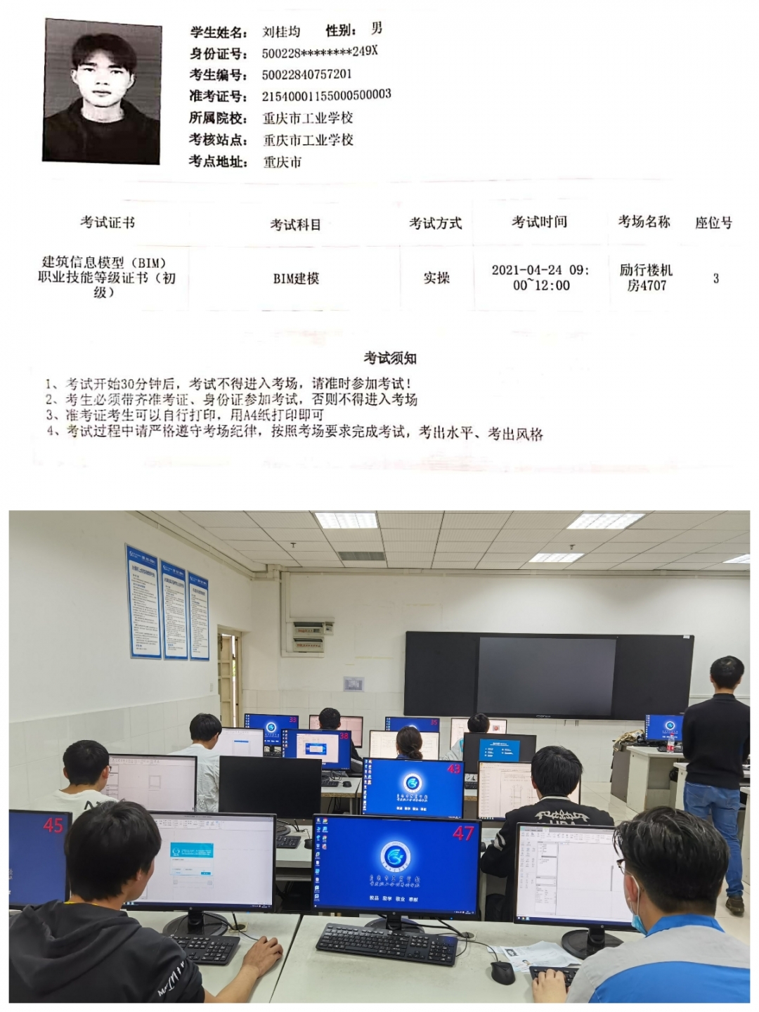 勇闯新高度 开启新征程 2021年4月24日, 建筑工程系开启了2021年BIM建筑信息模型首次鉴定工作,按照1+X工作计划和要求,17名同学参加了本次鉴定工作。 按照1+X第三方评价组织和省工办要求,建筑工程系 严格按照鉴定流程报备、报名、排考、监考和鉴定过程严肃认真,学校1+X工作办公室设置工作人员2人、系部监考2人、 主1人,同时由纪委书记左磊、副校长吴邦用担任巡考。 为实现课证赛研的融通,培训鉴定不选拔、不掐尖,在开设《BIM技术应用》课程的基础上进行整体鉴定,同时积极参加行业、市级技能竞赛,累计获取二等奖3个、3等奖2个,参与1+X重点项目课题1个、积极主持申报十四五规划课题1个、主持编写重庆市建筑类统一教材《建筑BIM技术》,实现了教师先补给、以点带面的预定目标。 相信在国家和相关部门政策的调控下,建筑工程系已经在 BIM技术应用方面已经做好准备,随时应对新机遇、新挑战,勇闯新高度,开启新征程。