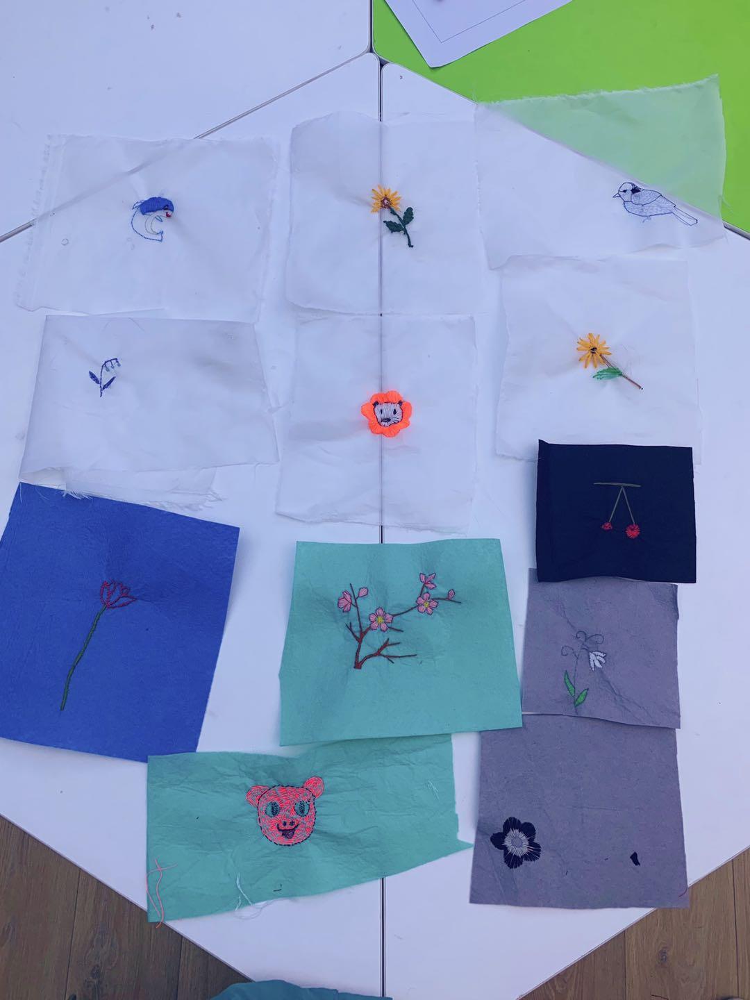 大家开始穿针引线。手绢花纹以花草为主,指导老师现场教授大家绣制花瓣的针法以及技巧,现场的很多人都是第一次刺绣,边做边问,生怕错了一个细节,影响自己作品的美感。