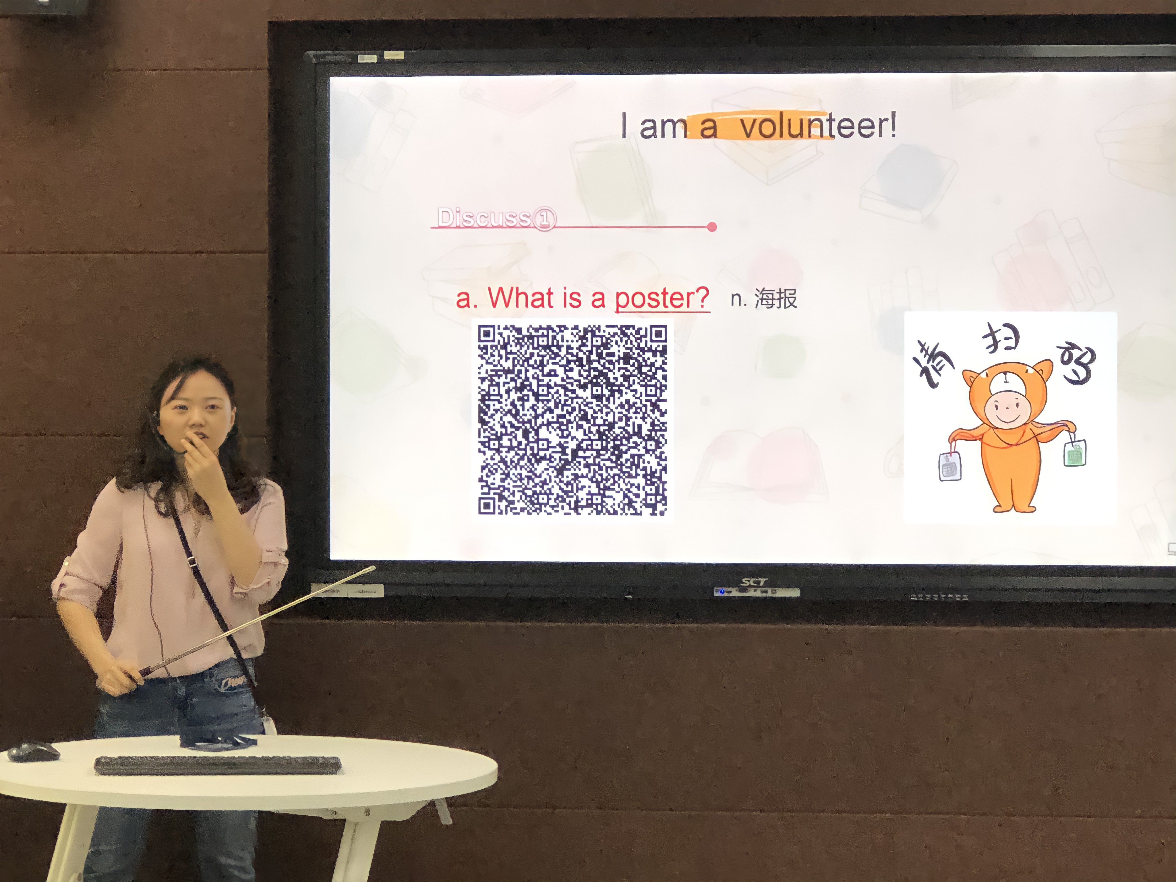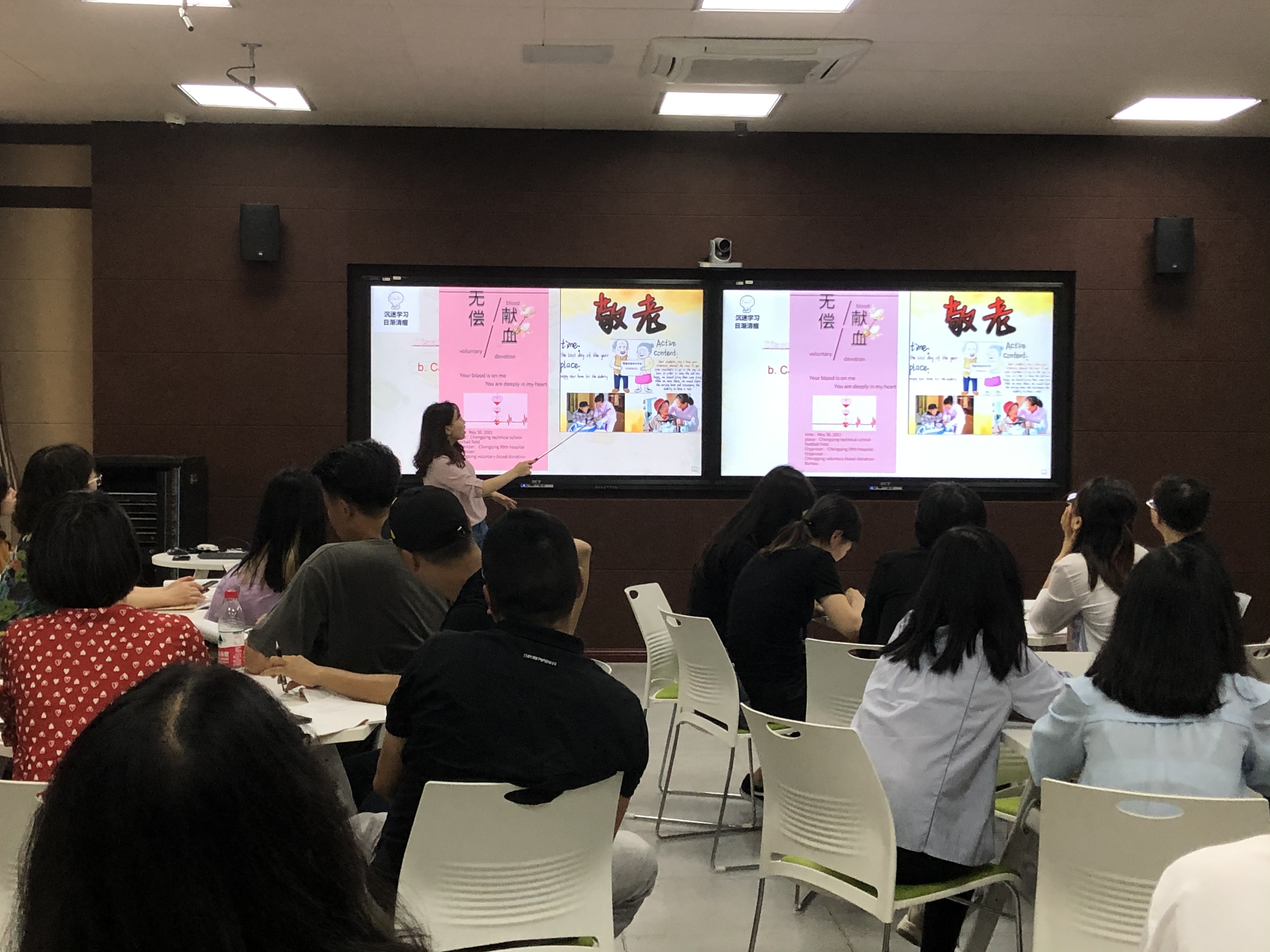 最后,英语教学团队的向海霞老师向大家展示了“志愿海报制作”课堂实例。导入的视频中,志愿者以英文分享了参加活动的感受,拓展了志愿者活动的相关知识,培养学生的志愿精神,无声地融入思政教育。课堂任务中融入了学校的特色“红岩文化”,组织学生观看红岩展演,布置任务制作一张红岩博物馆招募讲解员的海报。同时,在美化海报的环节中,提升了学生的审美水平。