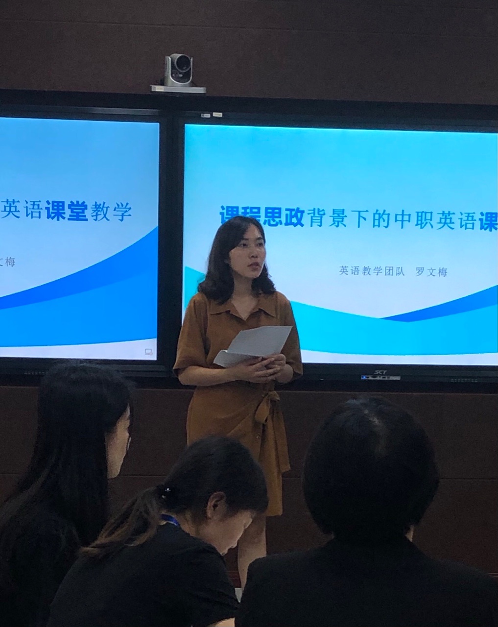 活动的第一项,英语教学团队的罗文梅老师以中职英语课堂教学为例,分享如何搭建课程思政。首先,罗老师深入解读课程思政的基本概念和相关学习文件,牢牢把握改革的重点,明确了英语课程思政是通过深化课程目标、内容、结构、模式等方面的改革,把政治认同、国家意识、文化自信、人格养成等思想政治教育导向与中职英语课程固有的知识、技能传授有机融合,实现显性与隐性教育的有机结合,促进学生的自由全面发展,充分发挥英语课程的育人的作用。然后,从教师、教材、教法入手,进一步明确了课程思政的实施途径,深挖思政元素,以“志愿海报制作”单元为例,详细分享了本单元的教学设计。罗老师强调,教师在教书时要注重育人功能,将思政教育潜移默化地融入授课过程,摒弃思政教育与课堂教学无关的“无用论”。