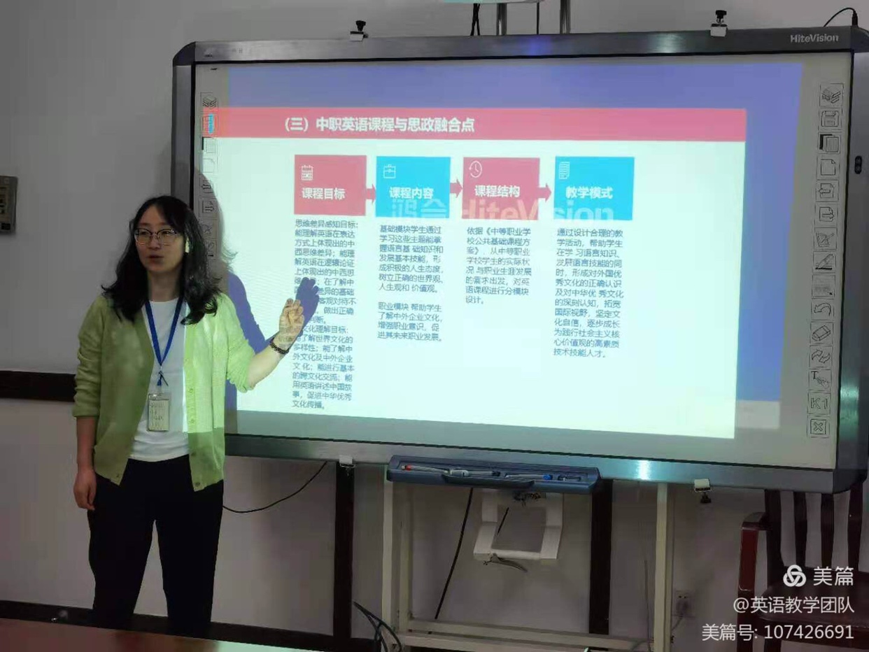 罗文梅老师解读了中职英语的课程目标、课程内容、课程结构和教学模式,并结合思政元素做了教学示范。