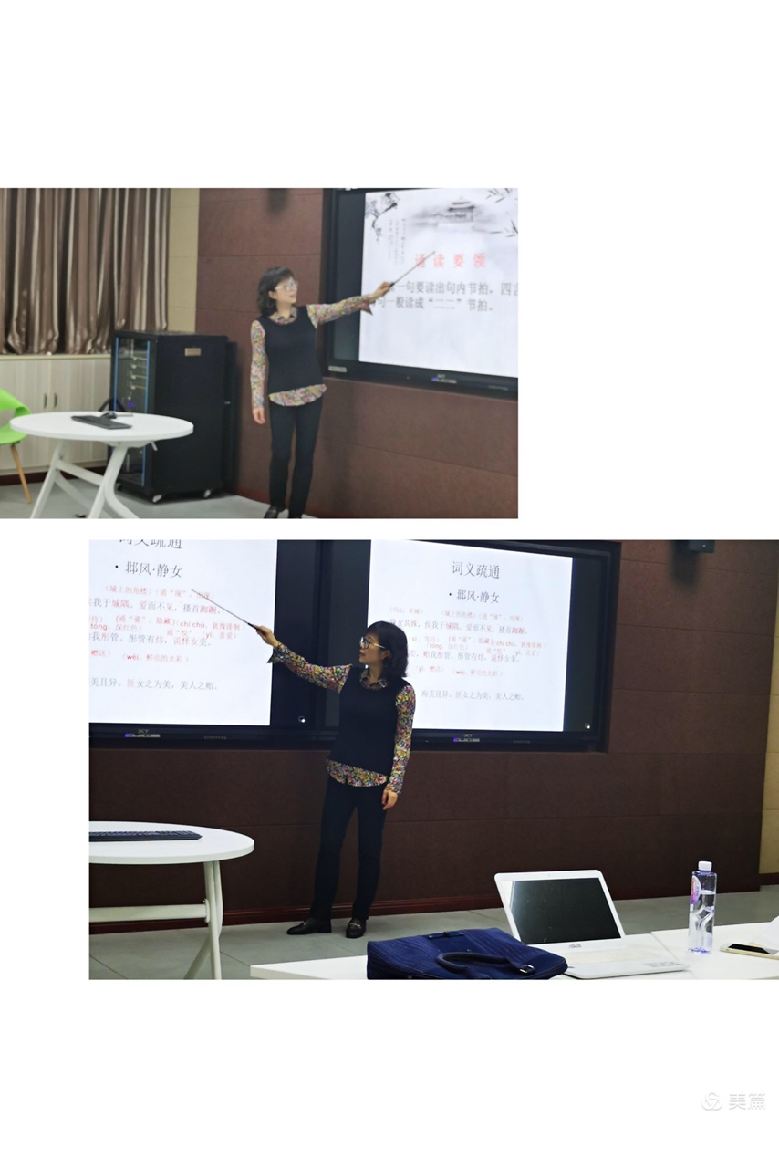 江老师首先向学生传授诗歌的诵读要领,带领学生通过关键字词的解释翻译全文,掌握诗歌大意。在翻译了解课文内容的过程中,江老师将文中女主人公赠礼与男主人公这一点提出来,教导学生们,古代的爱情是单纯美好的,但我们在现实生活中,在将来拥抱爱情的时候,不能做一个太物质的人,不能只追求充满物质的爱情,将爱情物质化。爱情不是生活的全部,我们更应该不断提高充实自己,让自己变得越来越优秀,茂密的大树才会引来无数的鸟儿和美丽的蝴蝶。