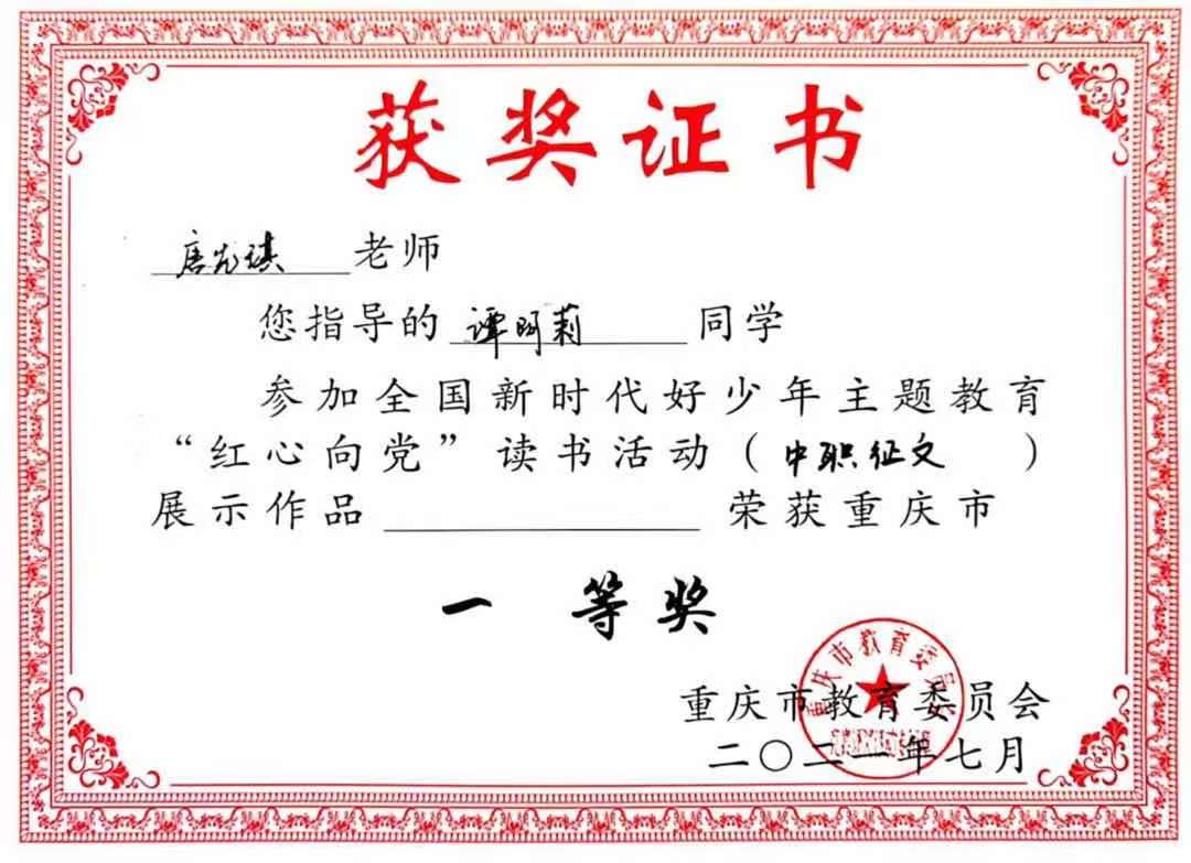 我校学子在接收到比赛讯息后积极参与,经过校内征文比赛后共有34名同学的征文作品脱颖而出。语文组全体老师分配任务后对34份征文作品做出进一步的悉心指导,参与了市赛,共取得25份荣誉:一等奖2名,二等奖7名,三等奖16名。