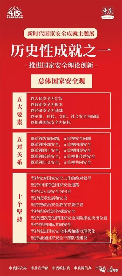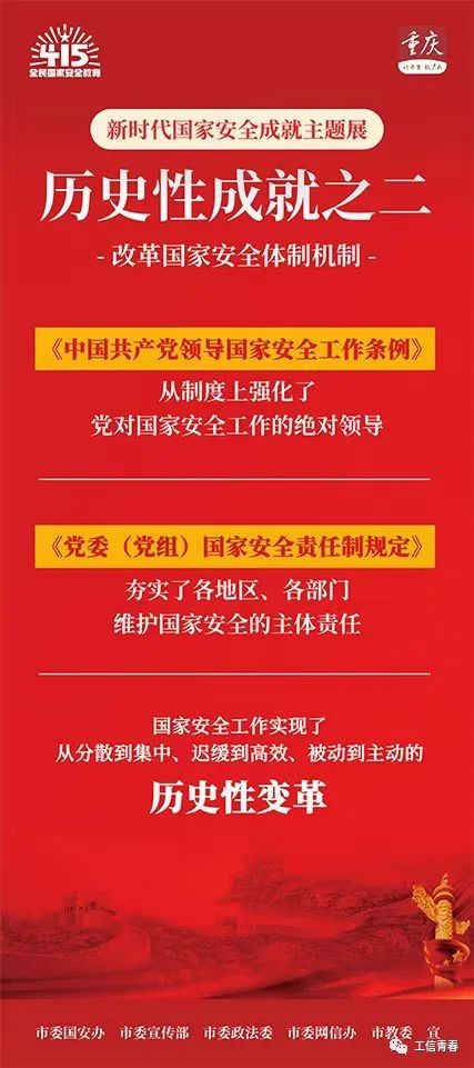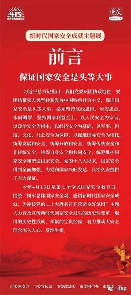 2022年4月15日是第七个全民国家安全教育日。倡导开展“树牢国家安全观,感悟新时代国家安全成就,为迎接党的二十大胜利召开营造良好氛围”为主题的活动。4月15日-17日,校学工部、校团委组织各班班级开展了“国家教育日”主题教育班会。 图片来源:龙华网|新重庆 班会上同学们观看了多位选手的国家安全演讲视频、宣传教育片;深刻学习了“保卫国家安全是头等大事”;了解了四项历史性成就、六条宝贵经验,十九类我们身边的国家安全;参与了手机平台国家安全知识竞赛等科普活动。 会后,同学们表示:“国家安全离我们并不遥远,甚至就在我们的身边。我们每一个人都是国家安全的一道防线,维护国家安全需要我们每个人都共同努力!作为新时代的一员,维护国家安全,守护伟大祖国,是我们共同努力的方向!” 山河无恙 你我相安 家是最小国 国是千万家 国家安全 人民才能幸福 自觉做国家安全的坚定捍卫者 汇聚起维护国家安全强大力量