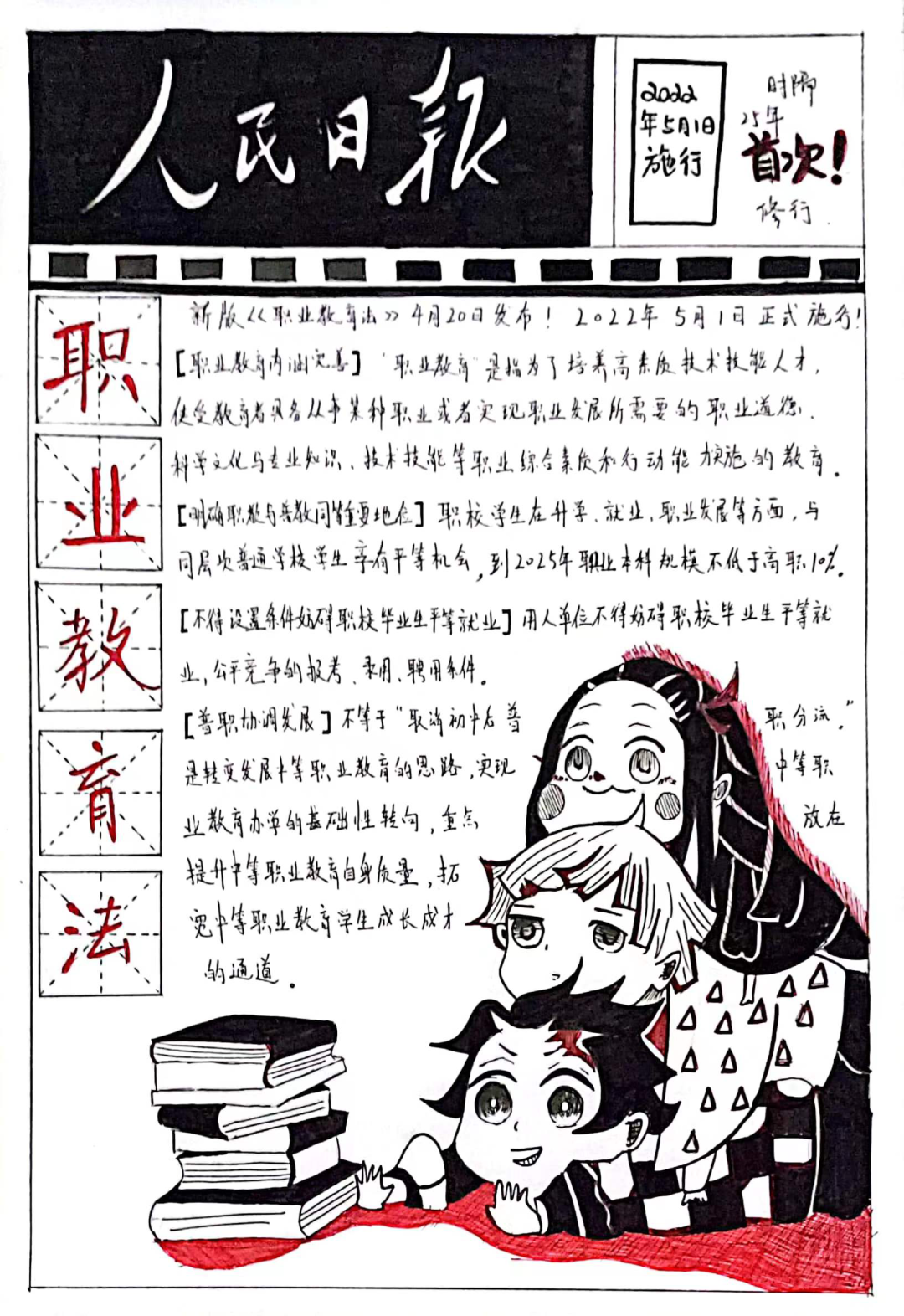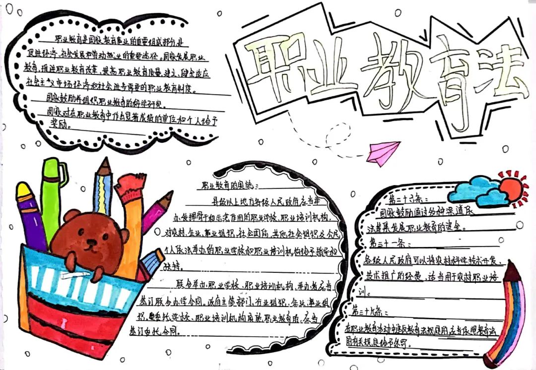 职业教育法手抄报比赛开始以来,校团委共收到300余份参赛作品,在系部推荐、专业老师评选后,共有20份作品脱颖而出!让我们一睹为快! 计算机216 张入心、范云川 教育213 钟其兰 造价201 李馨 学前201 刘锦榕 轨运211 张思雨 制药211 杨莉媛 教育211 钟瑞祺 电技211 叶琪 教育212 陈春媛 计平214 刘明 教育211 郑群 教育211 张琴 学前204 凌洪英 教育212 徐瑞韩 教育211 雷为曼 电技211 谭若瑄 学前204 段颖 计算机215 朱琳 教育212 罗佳欣 学前201 宋姗姗 恭喜以上获奖同学,请于6月3日凭身份证、校园卡至校团委办公室领取证书与小礼品! 看到这,你是不是也心动了呢? 心动不如行动!快快点击蓝色字体,查看更多活动,下一个获奖者,就是你! 下周将选取代表作品在校内宣传栏内展出!各位同学,走过路过不要错过哟!